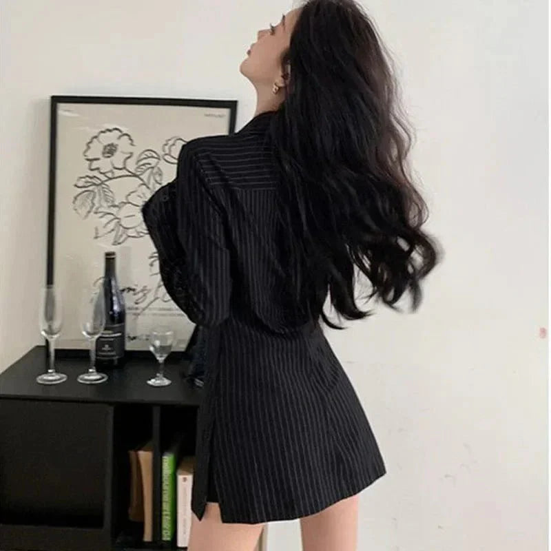 Lyft din outfit med denna sofistikerade svarta blus med subtila vertikala ränder. Den figursydda designen med klassisk krage och knäppning framtill skapar en balanserad look mellan professionell och chic. Perfekt att bära som en statement-piece över en kjol, byxor eller som klänning med höga stövlar. En garderobsklassiker för varje modern kvinna.